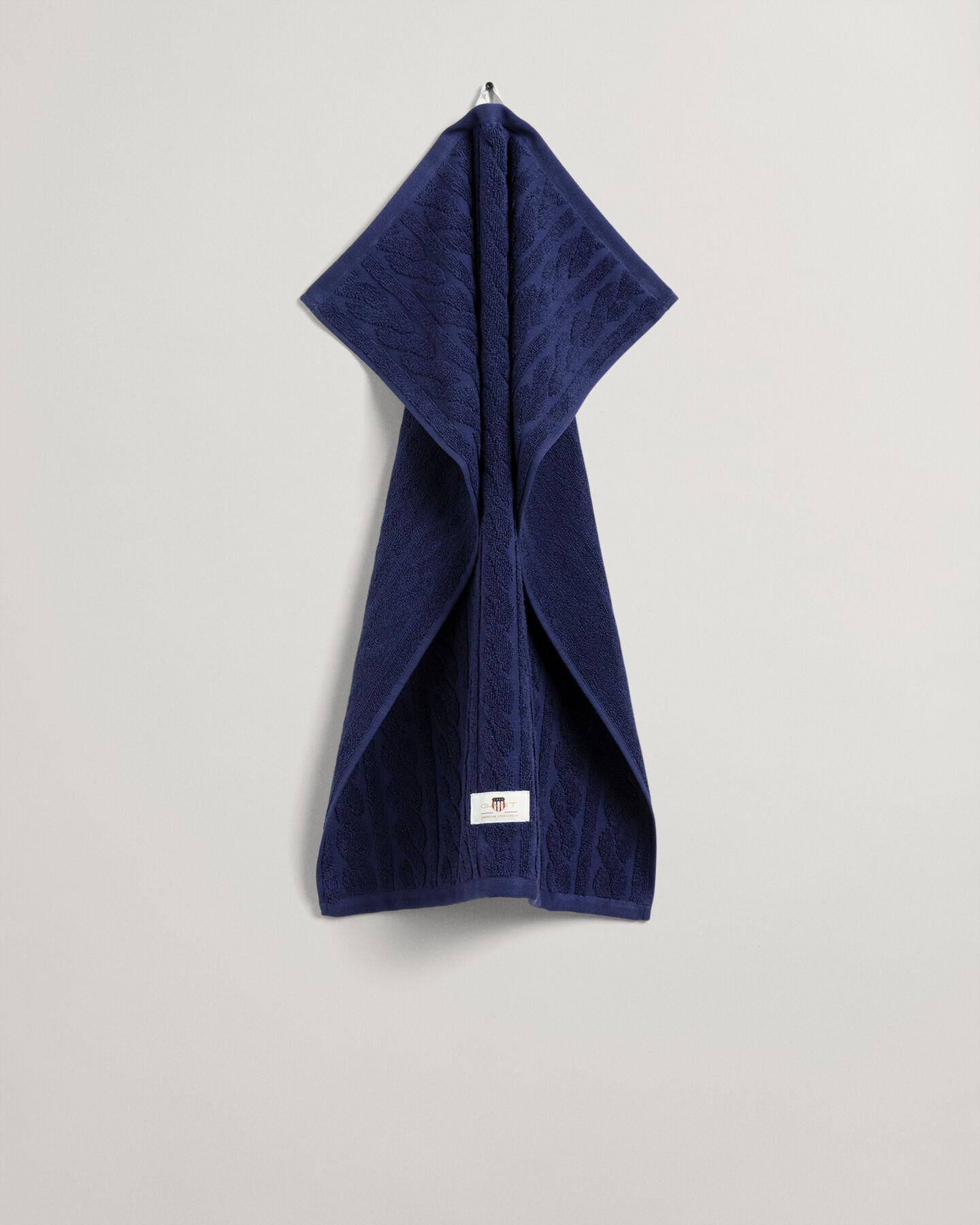 Handduken har en klassisk kabelstickad struktur med vävd etikett och är ett elegant tillskott med marin känsla till badrummet. Den är gjord av ekologisk bomull som har framställts på ett miljömässigt och socialt ansvarsfullt sätt. Dessutom har vi adderat en innovativ växtbaserad finish som ger bättre uppsugningsförmåga och en ännu mjukare känsla.