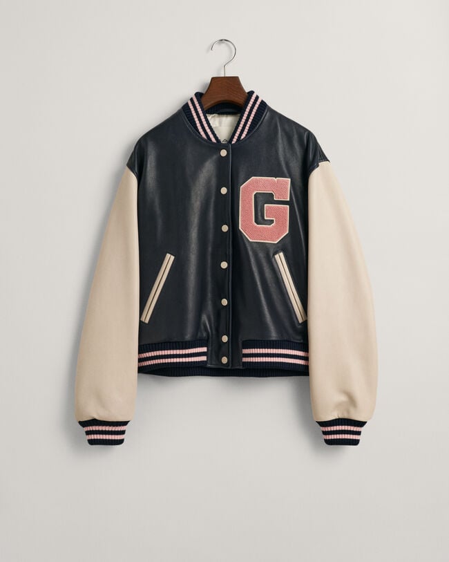 Det här plagget tillhör vår premiumkollektion: GANT 240 Mulberry Street. Den nya kollektionen hedrar vårt arv som pionjärer inom American Sportswear genom att ta preppy klassiker och utveckla dem till nya silhuetter gjorda av de finaste tygerna. Klassisk collegejacka i nytolkning, tillverkad av mjukt lammskinn. Den är helfodrad i certifierad viskos och vadderad med återvunnen polyester samt har en oversized fit som slutar vid höften. Med passpoalfickor i skinn, lackade tryckknappar, locker loop i ryggen, G-märke av frotté i collegestil på bröstet och randiga ribbstickade muddar. Plagget har en oversized fit. För en mer figurnära passform rekommenderar vi att du väljer en mindre storlek.
