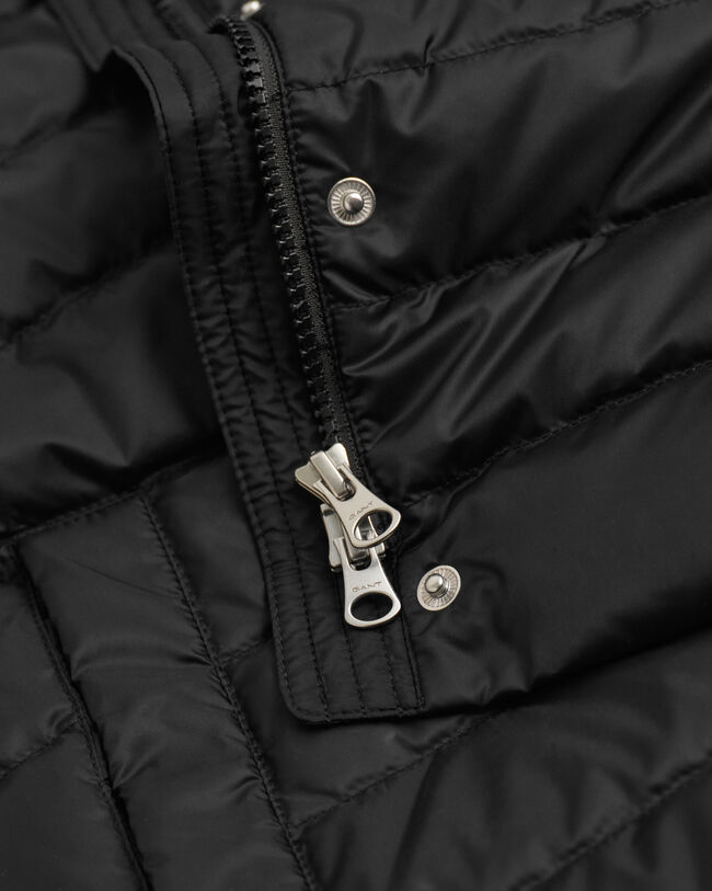 Lätt dunväst med 90% dun och 10% fjäder som kan användas som ett extra lager året runt, gjord i supertunn certifierad och återvunnen polyester med vattenavvisande yta. Den har regular fit och slutar strax ovanför höfterna, vilket gör den perfekt att bära ensam över en skjorta eller under en kappa när det är kallt ute. Ståkrage, lackade tryckknappar, sneda passpoalfickor, tvåvägsdragkedja och en tryckt Gant-logo på bröstet kompletterar plagget. Västen har en vattenavvisande DWR-beläggning (Durable Water Repellent) som hjälper till att leda bort vatten i lätt regn.