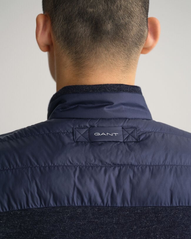 Det här är en praktisk övergångsväst och hybrid med quiltad, fodrad framsida och stickad baksida. Västen har foder av återvunnen polyester som ser ut och känns som dun, men torkar fortare, och har dragkedja fram, värmande ståkrage, två framfickor med dragkedja och en innerficka. En tryckt logotyp på bröstet och vår klassiska locker loop bak fulländar looken.