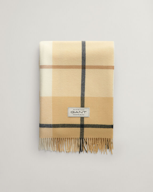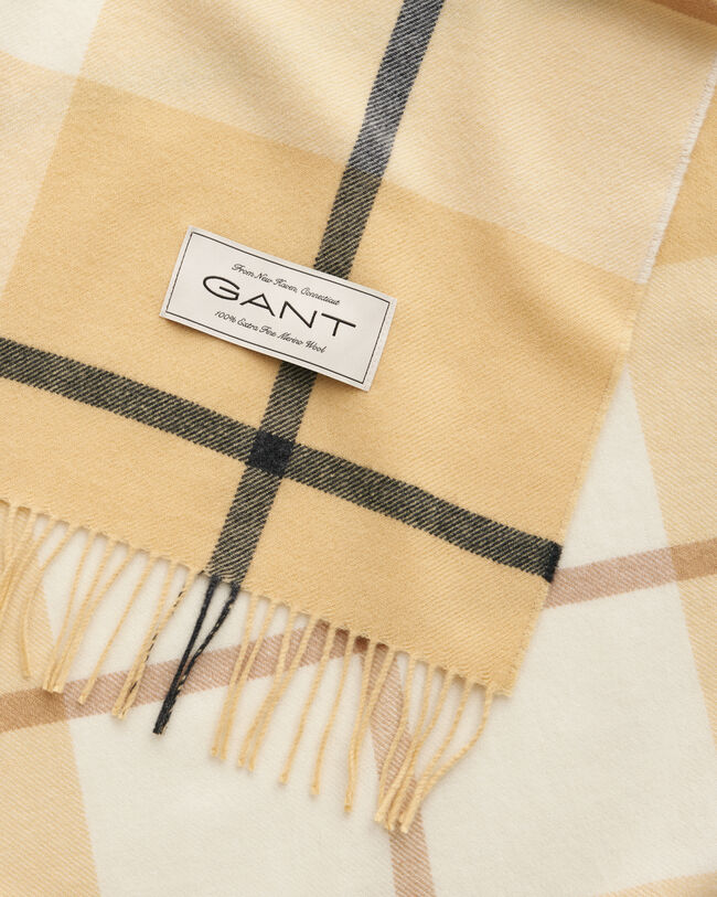 Pläd i extra fin merinoull som ger en mysig och strukturerad touch i alla rum. Med rutigt mönster, fransade kanter och en vävd GANT-etikett i nedre hörnet.