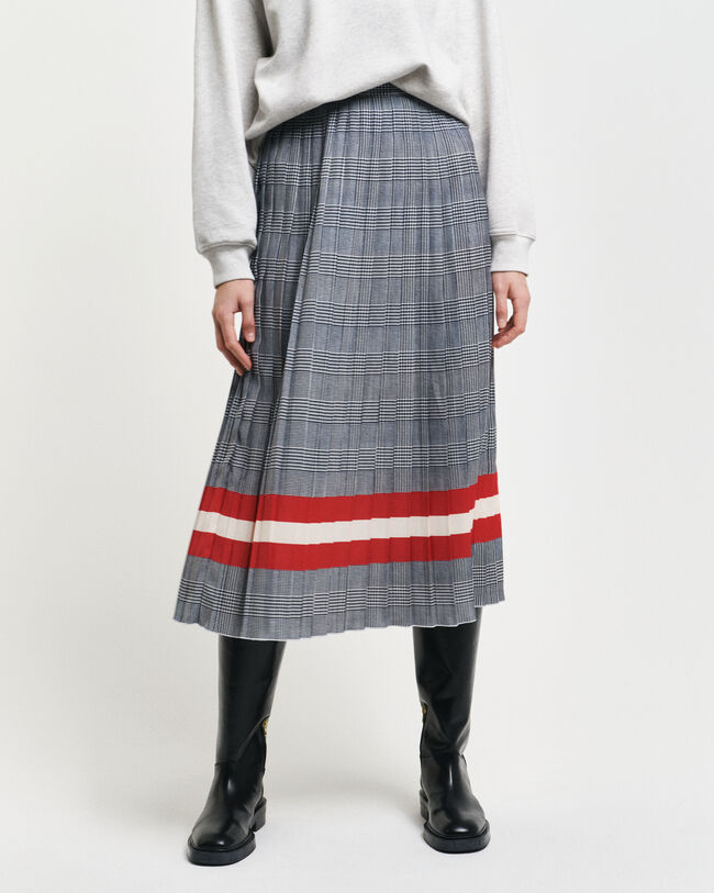 Veckad kjol i 100% återvunnen polyester som blandar säsongens rutor med kontrasterande ränder. Med normal passform, mellanhög midja och en midilängd som slutar mitt på vaden. Komplett med dold dragkedja i sidan samt hyska och hake i midjan.