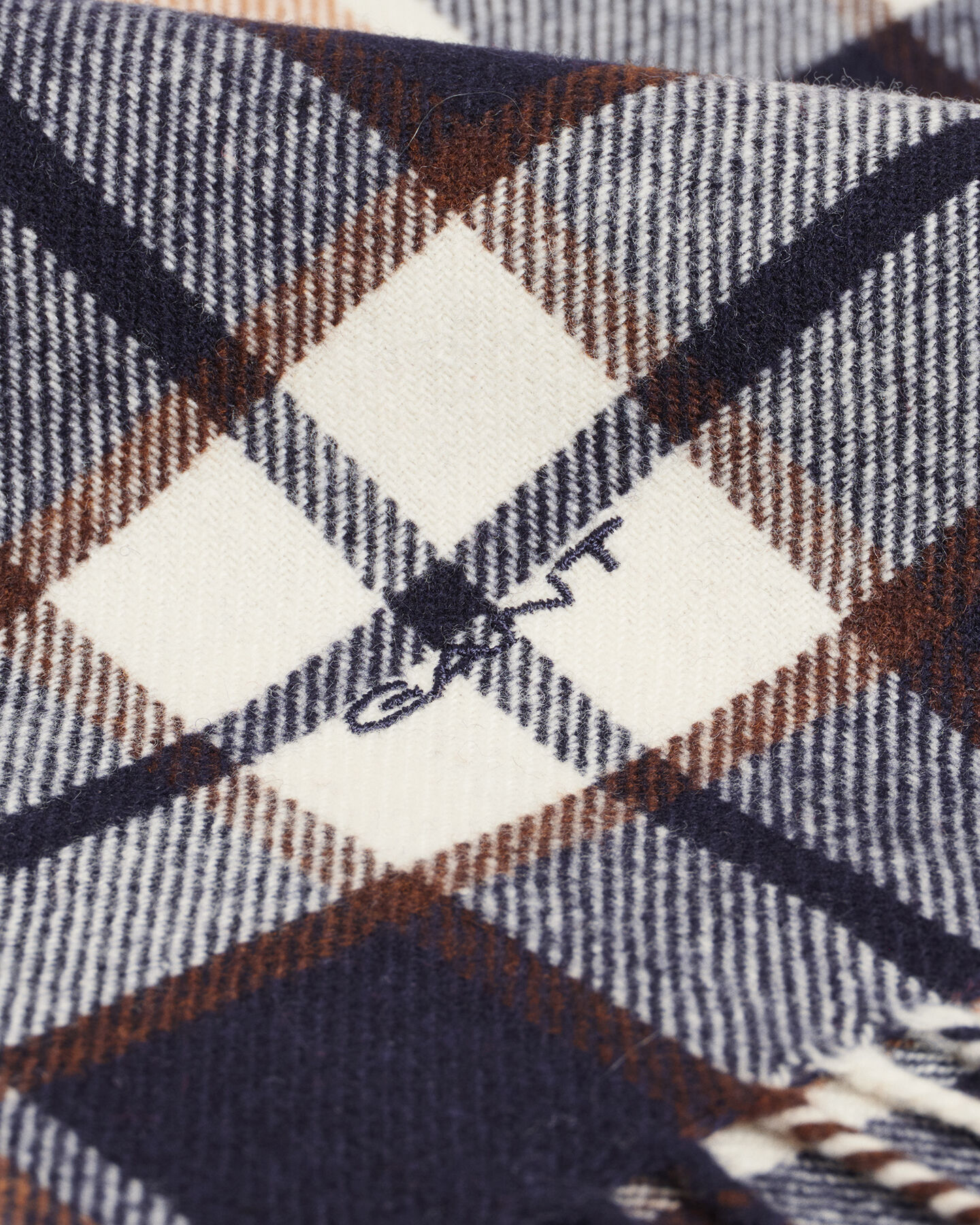 Sjal i 100% ull som är lyxigt varm och mjuk. Den har ett klassiskt rutmönster, fransade kanter samt en broderad GANT-logotyp ton i ton längst ner.