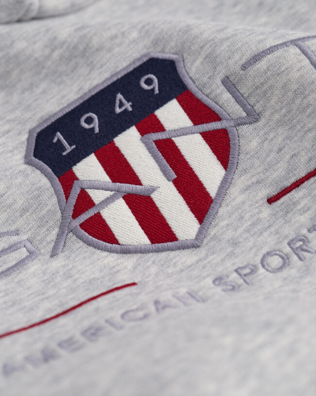 Hoodie i bomulls- och polyesterblandning, broderad med vårt ikoniska sköldemblem. Den har magficka och ribbstickade muddar – en äkta American Sportswear-klassiker.